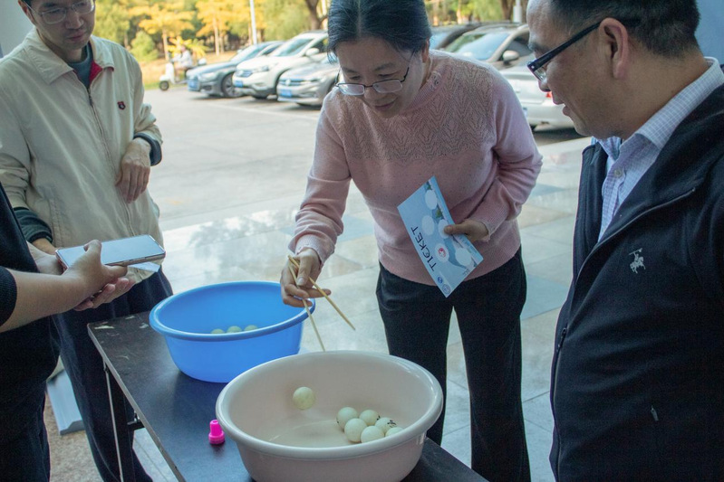 本次游园活动会共设有乒乓球掷准、筷子夹球、吹蜡烛、飞镖大战、盲人击鼓等五个项目。活动现场,教职工们活力满满,热情洋溢,展现出了物电学院教职工积极向上的阳光心态。