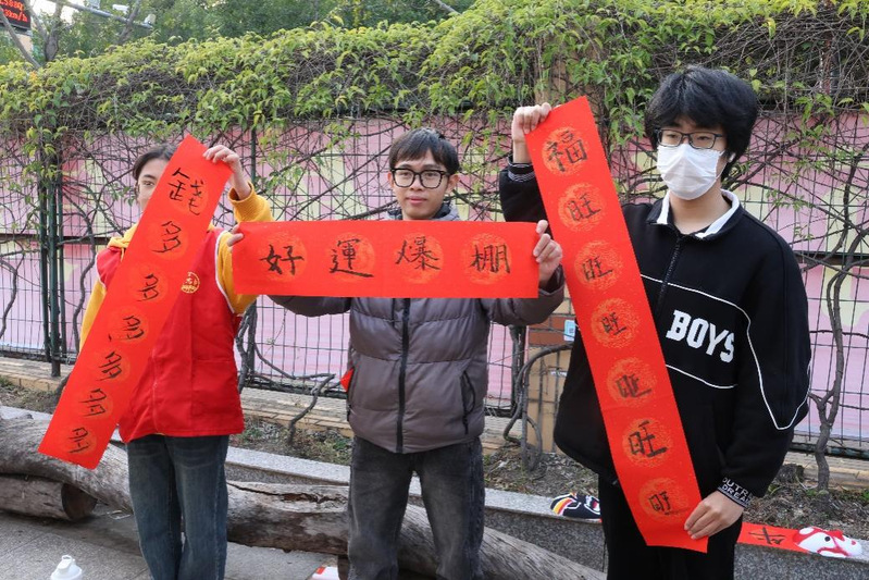 在写春联环节,浓浓的墨香弥漫现场。同学们一边书写“福”字和对联,一边感受新春的喜庆氛围。虽然书法略显稚嫩,但笔画间充满了青春活力与对未来的美好期盼。红纸黑字,寓意吉祥,洋溢着浓浓的年味。