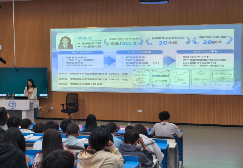 2022级海洋信息工程班蔡丽雯学姐分享了“挑战杯”竞赛赛制,分别阐述了大挑和小挑的赛道,并强调备赛时需注重团队组建的专业技能互补、选题的创新与可行,以及申报书和PPT的规范制作。