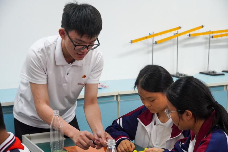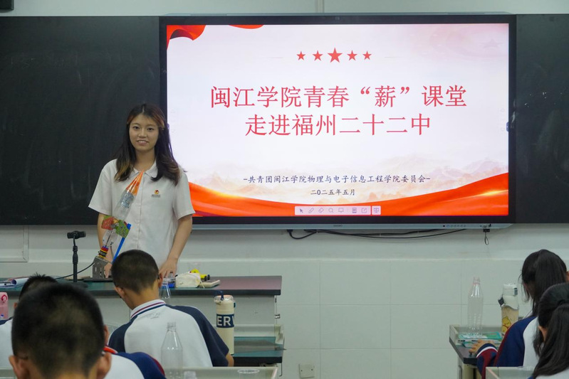 为扎实推进大中小学思政教育一体化建设,引领青少年厚植科技报国情怀,5 月15日下午,物电学院青春“薪”课堂携手“蒲公英”宣讲团走进福州二十二中,开展“水火箭里的航天思政课”主题科普宣讲活动。本次活动以“理论浸润+实验解密+创意实践”相结合的方式,将航天精神的火种与物理知识的养分播撒进青少年心田,打造了一堂别开生面的沉浸式科学思政课。