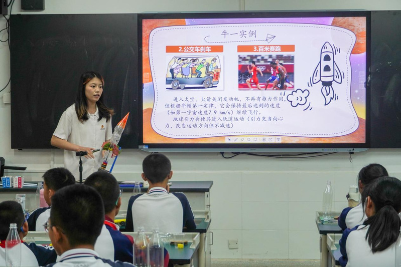 在“互动实验・解密火箭”环节,宣讲员化身“科学导师”,以生活场景为切口破解航天科技密码。她以“公交车刹车时乘客前倾” 现象类比牛顿第一定律,用趣味动画演示火箭燃烧室高压燃气喷射的反冲过程,直观解析牛顿第三定律在航天领域的应用,让同学们对“航天科学并非遥不可及,而是源于生活中的物理原理”这句话有了深刻的理解。