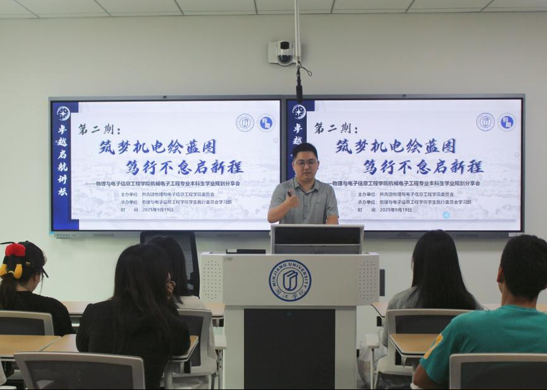 为推动学业规划与职业发展有机衔接,引导学院学生科学谋划成长路径、厚植竞争优势,9月19日,物电学院成功举办“卓越启航讲坛”第二期——“筑梦机电绘蓝图,笃行不怠启新程”暨机械电子工程专业学业规划分享会。活动由院学生会学习部精心策划,特邀智能制造系何源福老师、辅导员白洁玉主讲,2024级机械电子工程专业近50余名同学积极参与。