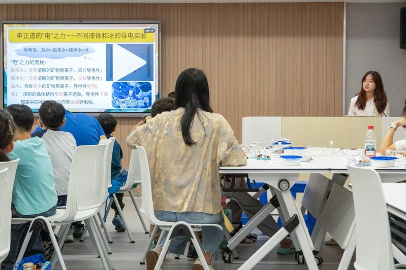 活动以电影《哪吒之魔童降世》中申公豹“操控雷电”的场景为切入点,拉开首个实验的序幕。授课志愿者吴思怡抛出“电流如何点亮灯泡”的问题,生动讲解导体与绝缘体概念。孩子们在科普志愿者的指导下分组搭建简单电路,依次测试纯净水、自来水、盐水和冰块的导电性,观察并记录小灯泡的亮度变化。通过对比实验现象,理解溶液中离子浓度对导电性的影响,并引申讲解中国特高压输电技术如何利用高效导电材料减少损耗,将基础实验原理与国家重大工程成就紧密结合,让科学知识更具现实意义。