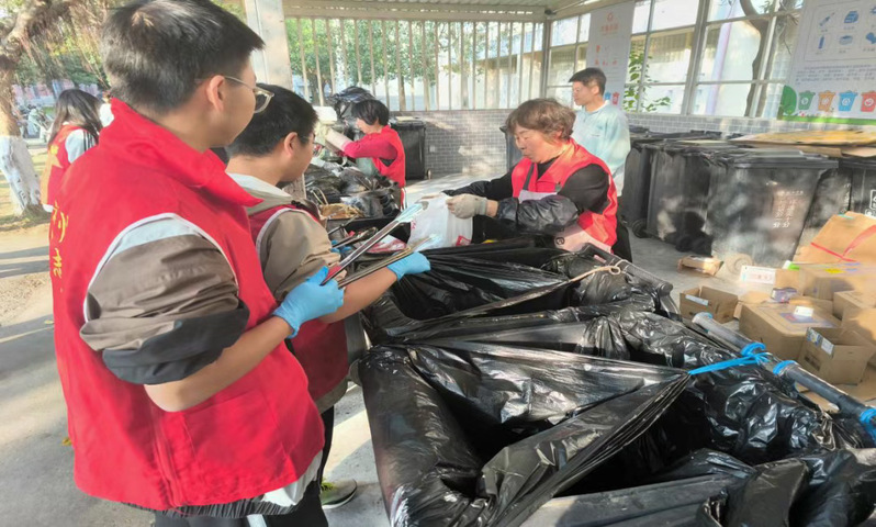 学院师生代表们前往求实社区垃圾分类亭,现场学习物业工作人员垃圾分类操作流程,并亲身体验实践,明确垃圾分类对于环境保护和资源回收的重要意义。