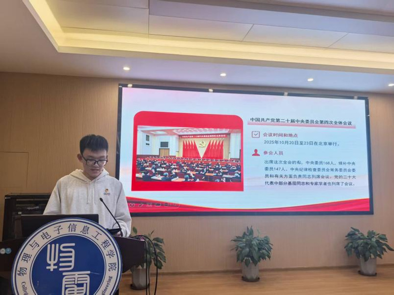 为深入学习贯彻党的二十届四中全会精神,进一步引导青年学生把握国家重大战略部署,近日,物电学院党务中心组织开展了党的二十届四中全会精神专题学习会。学生党员和入党积极分子代表参加了学习会。
