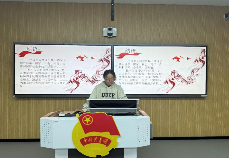 张雅憩同学致敬“中国氢弹之父”于敏的人生历程。这位隐姓埋名数十载的科学家,以独创的“于敏构型”助力中国氢弹研制创下世界纪录,用最短时间实现氢弹技术突破。他始终秉持“把微薄力量融入祖国强盛中”的信念,以无私奉献、淡泊名利的品格,诠释了沉默背后震撼世界的家国伟力,让在场学子深切感受到科研工作者的赤子之心。