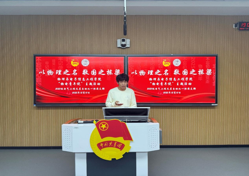 为引导青年学子传承科学家精神、勇担强国建设使命,12月10日晚,“物电之声”读书社在教学楼举办“以物理之名,敬国之栋梁”主题青年说活动。本次活动由物电学院2025级电气工程及其自动化1班团支部承办,4位物电学子依次登台,循着王大珩、于敏、杨振宁、孙家栋四位科学巨匠的人生足迹,深情讲述他们的传奇故事与家国情怀。