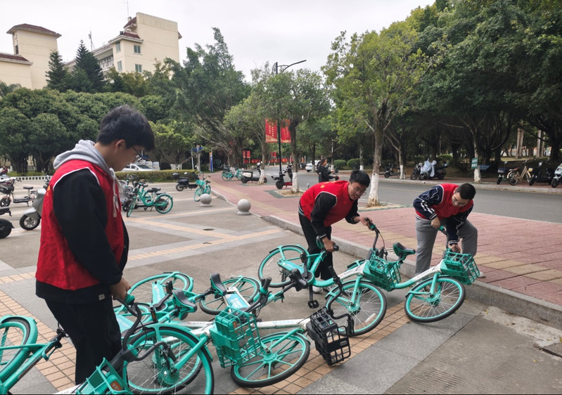 为优化校园环境,3月13日下午,共享单车规范停放志愿服务活动在校园内如火如荼地进行。为了提高活动的实效性,班级同学们提前进行了分组和任务分配。志愿者们在校园各大食堂前的共享单车停放点展开行动:一组负责清理车筐内的杂物,确保单车整洁;一组有序摆放散乱的单车,维持区域秩序;另一组则耐心地向同学们宣传文明停车的规范与重要性。
