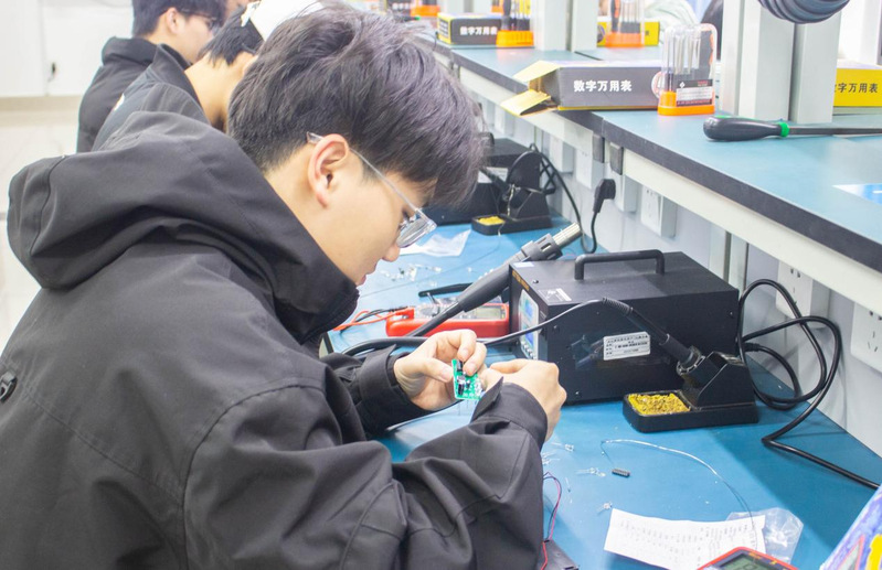 比赛现场,50 余名选手早早候场,蓄势待发。随着开赛指令下达,场内瞬间安静下来,只听得电烙铁发出的低频嗡鸣声与焊锡丝细微的轻颤声交织。选手们全神贯注,手指灵活操作,在电路板上精准定位电子元件,流畅走线,焊点如繁星般均匀散落。他们专注投入的神情与娴熟利落的动作,充分展现了扎实的专业功底,也深深感染了在场的每一位观众和评委。