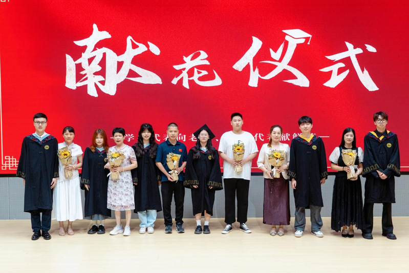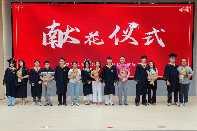 在感恩致谢环节,毕业生代表向毕业班班主任、辅导员献花,寓意向精心培育学生成长成才的学校和学院、辛勤教导的老师表达最衷心的感谢和最崇高的敬意。