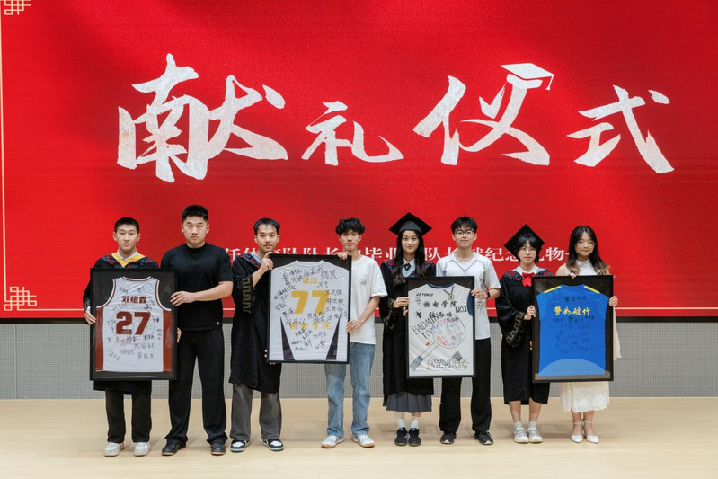 为鼓励加强体育锻炼,传承拼搏奋进的体育精神,现任体育队队长携全体队员签名的球衣,向毕业班队长献礼,期许毕业生们以强健体魄奔赴未来。