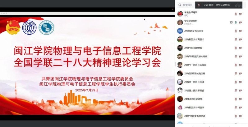 为深入学习贯彻习近平总书记重要贺信和党中央致词精神,7月29日,物电学院组织召开全国学联二十八大精神专题线上学习会,会议由学院学生会指导老师姚嘉杰主持。各班班长、团支书以及院学生执行委员会全体干部齐聚“云端”,共同深入学习研讨全国学联二十八大精神。