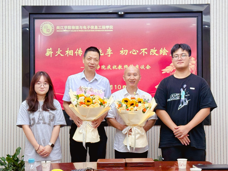 会上,举行了简短而隆重的退休欢送仪式。学生代表、2023级物理学(师范)专业吴思怡向物理系退休教师唐一峰献花,2024级电气工程及其自动化专业学生、“智维”义务维修队队长黄熠向社团指导老师吴寿强献花。表达对老师们的崇高敬意与诚挚祝福。同学们以花寄情,表达对老师们的感恩之情。
