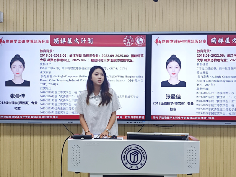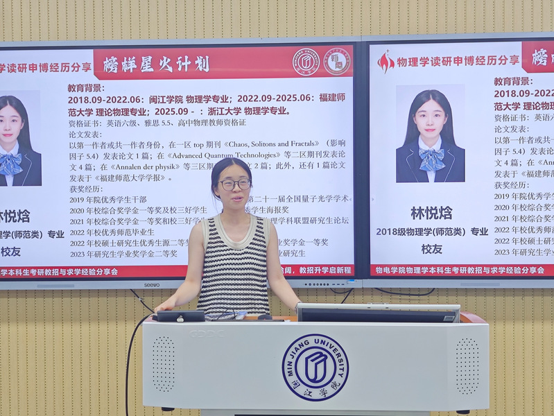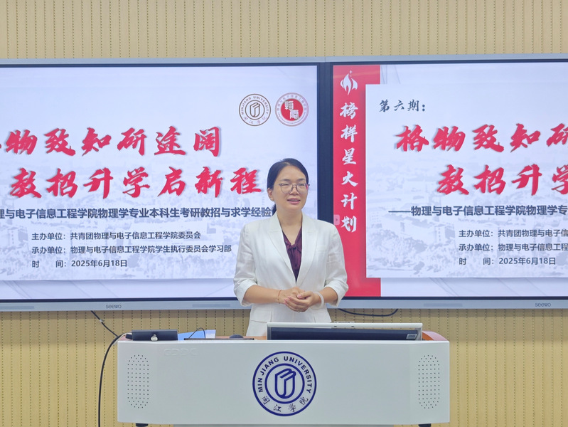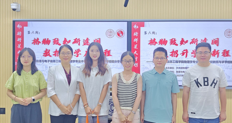 为引导学子科学规划学业与职业路径,增强考研、教招备考系统性与针对性,6月18日,物电学院成功举办“榜样星火计划”第六期活动——“格物致知研途阔,教招升学启新程”物理学(师范类)专业本科生考研教招与求学经验分享会。活动由学院学生会学习部策划承办,特邀2018级物理学专业校友林悦焓、张曼佳及四位2021级考研升学和教招就业的优秀学生代表交流分享。学院党委副书记张林雯、电科系副主任洪锦泉、2023级辅导员韩冰雪出席,辅导员白洁玉主持,共吸引了2022级、2023级物理学(师范)专业110余名学生到场聆听。