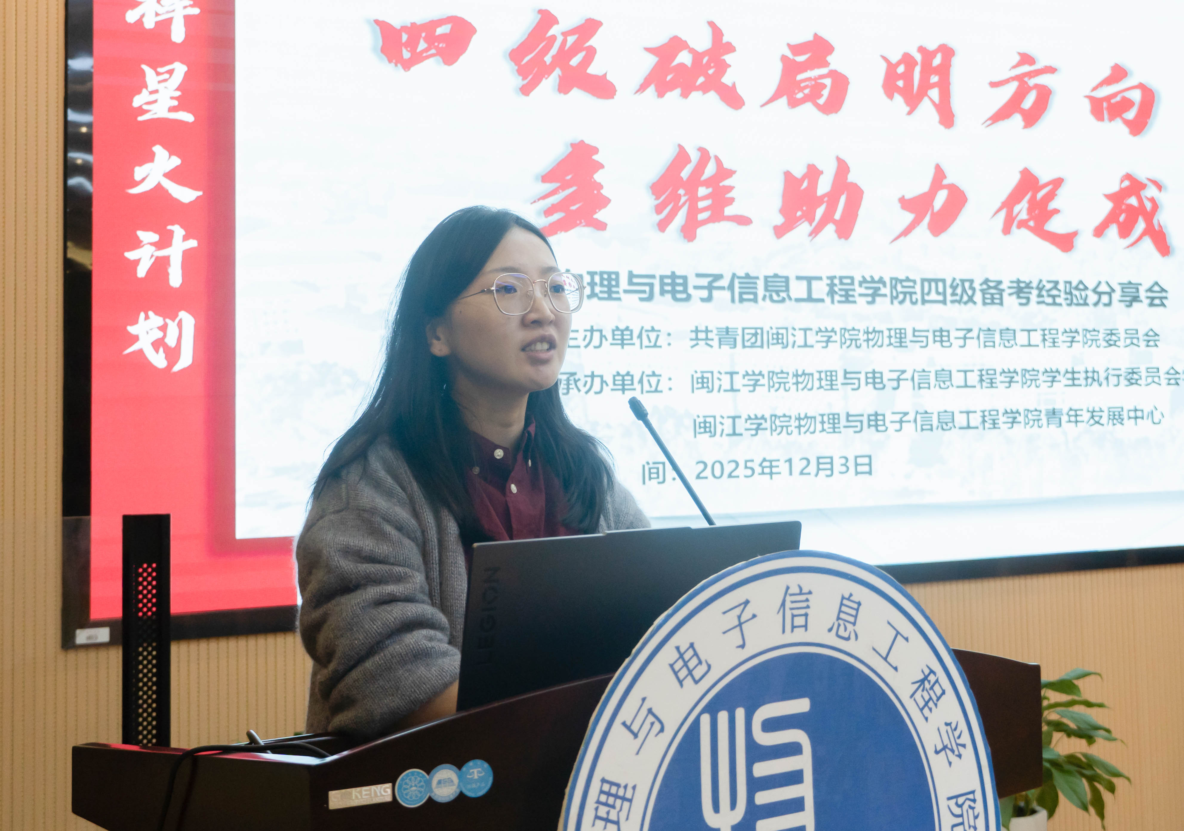 为帮助学生精准把握四级备考思路、提升备考效率,12月3日晚,物电学院成功举办“榜样星火计划”第九期暨勤学堂活动——“四级破局明方向,多维助力促成长”备考经验分享会。活动由学院学生执行委员会学习部和青年发展中心联合举办,邀请赵文锋、张家辉、邱振宇等三位已通过英语六级的优秀学生作为分享嘉宾,2023 级辅导员赖侹征、2024 级辅导员白洁玉出席,共吸引110多名有备考需求的学生热情参与。
